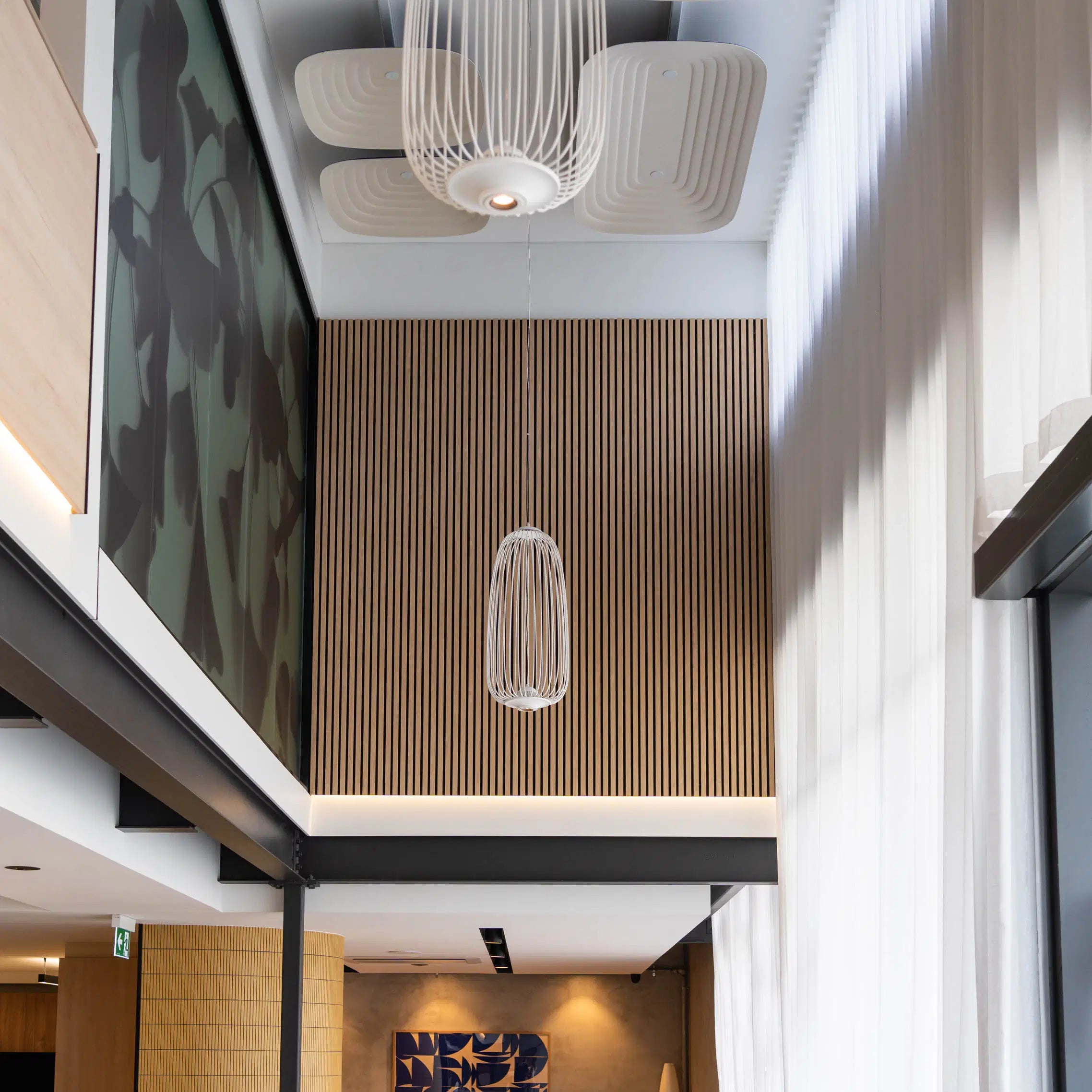 Produced with a luxury quality, smooth wood veneer finish, with a fire-rated, acoustic backing. Lamella strips with a clean, modern appearance are mounted onto a uniquely designed, recycled material.